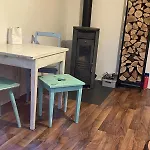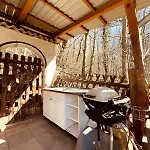 Villa Ruhiges Haeuschen Am Wald Mit Kamin, Terrasse est équipée d'équipements indépendants, notamment d'une cuisine équipée et d'un coin repas pour le plaisir des clients. Il y a aussi une bouilloire électrique, un réfrigérateur et un four disponibles dans la cuisine.